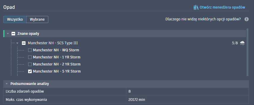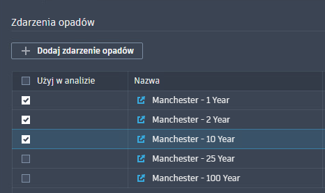 Wybierz, które zestawy danych opadów mają być używane do analizy.