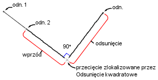 Polecenie Odsunięcie kwadratowe powoduje wyświetlenie odległości w przód oraz odległości odsunięcia względem punktu przecięcia.