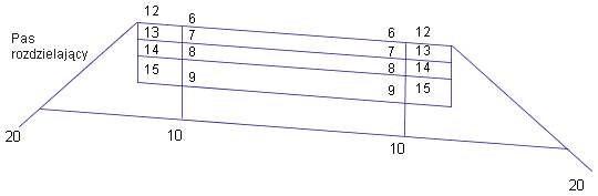 Poniższa ilustracja przedstawia położenie kodów połączeń standardowych w podzespołach definiujących podzieloną drogę z obniżonym pasem rozdzielającym i rozszerzonymi poboczami.