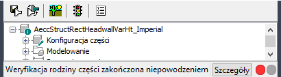 Jeśli w modelu występują błędy na pasku stanu pojawi się komunikat informujący o niepowodzeniu sprawdzania części i zostanie otwarte okno dialogowe z listą błędów. Należy zapoznać się z błędami, wprowadzić niezbędne modyfikacje i powtarzać czynności aż do uzyskania pomyślnego wyniku sprawdzania.