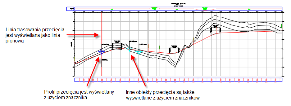 Można dodać przecięcia do widoków profili, aby zidentyfikować miejsca, gdzie elementy liniowe przecinają profil względem macierzystej linii trasowania.