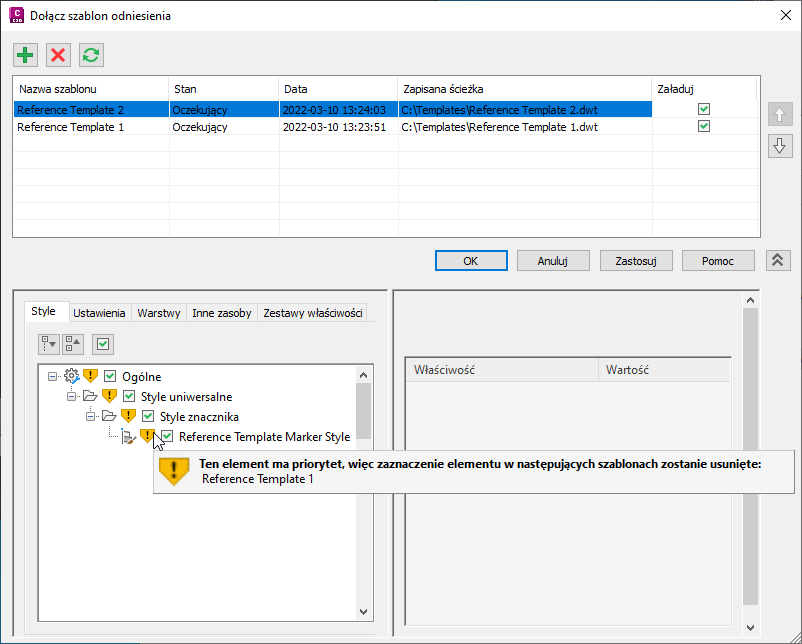 Po kliknięciu przycisku Zastosuj lub OK style i ustawienia są stosowane, duplikaty są usuwane z szablonów o niższym priorytecie, a alerty są usuwane.