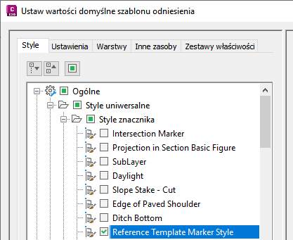 Zaznacz pola wyboru dla stylów i ustawień, do których mają domyślnie istnieć odniesienia. W poniższym przykładzie wybrano styl znacznika szablonu odniesienia.