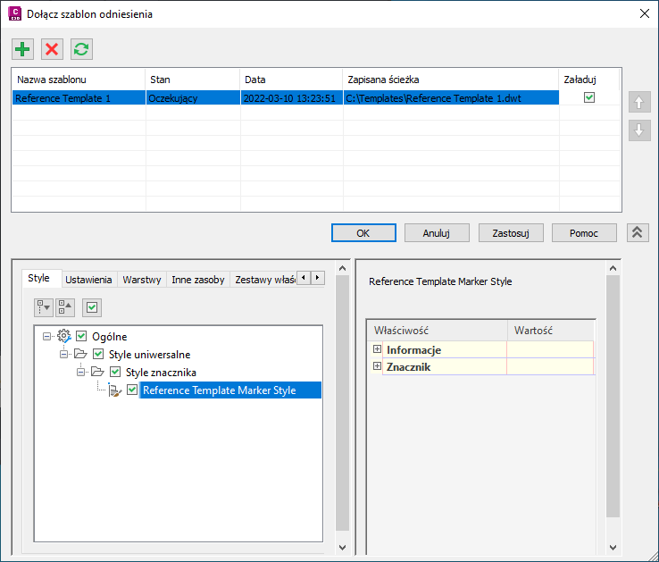 Uwaga: Po wyczyszczeniu pola wyboru Załaduj i kliknięciu przycisku Zastosuj lub OK, nieużywane komponenty z szablonu odniesienia zostaną usunięte z rysunku, a rysunek nie będzie aktualizowany o dalsze zmiany wprowadzone do szablonu odniesienia. Komponenty, które zostały użyte, takie jak warstwy, pozostaną na rysunku.