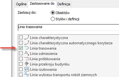 W przypadku większości typów etykiet, na karcie Zastosowane do Menedżera stylów, wybierz typ obiektu, który chcesz opatrzyć etykietą, a nie powiązaną etykietę obiektu (wyjątki opisano poniżej). Przykładowo, aby oznaczyć linie trasowania danymi właściwości, wybierz linię trasowania podczas ustawiania zestawu właściwości.