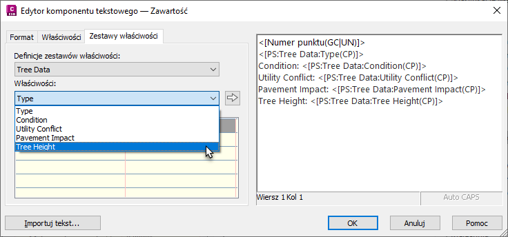 Ten zestaw właściwości należy zastosować do punktów, a następnie dodać odpowiednie dane zestawu właściwości do etykiety stylu rzutowania za pomocą Edytora komponentu tekstowego.
