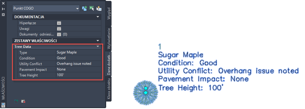 Poniższa ilustracja przedstawia punkt oznaczony danymi drzewa ustawionymi w zestawie właściwości.