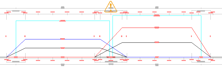 W poniższym przykładzie pikieta Zakończ szynę poziomą drugiego łuku nakłada się na pikietę Rozpocznij szynę poziomą pierwszego łuku. W widoku przechyłki kolejowej w miejscu nakładania się pikiet jest wyświetlana ikona