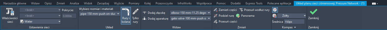 Wstążka Układ planu sieci ciśnieniowej opartej na częściach umożliwia utworzenie sieci ciśnieniowej opartej na częściach w widoku planu.