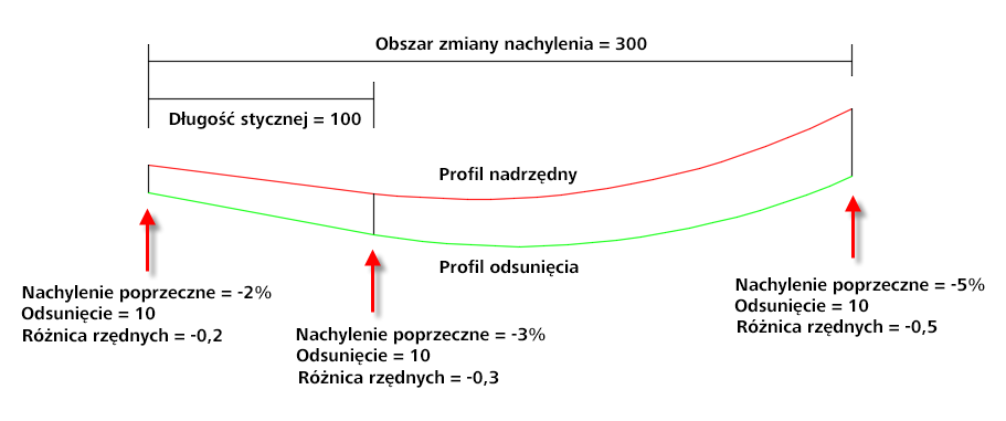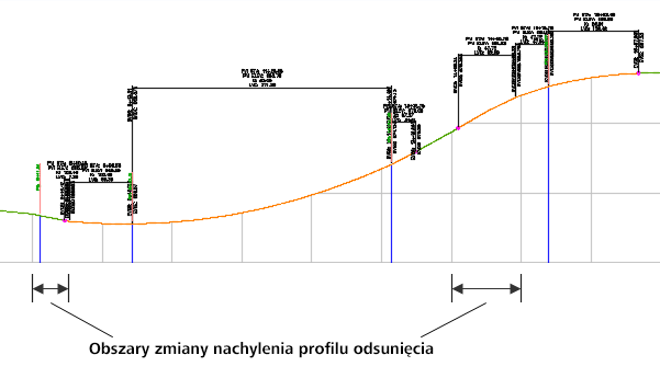 - W parabolach i łukach kołowych w regionie zmiany nachylenia będą używane wartości K lub R krzywych profilu odsunięcia, które zostały obliczone przed zastosowaniem zmiany nachylenia.