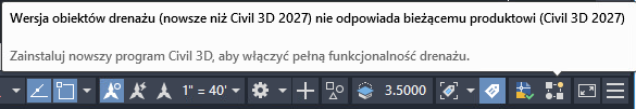 - Jeśli obiekty drenażu zostały utworzone w nowszej wersji programu Civil 3D, wyświetlana jest etykieta narzędzia „Wersja obiektów drenażu jest niezgodna z bieżącym produktem”. Ikona zgodności