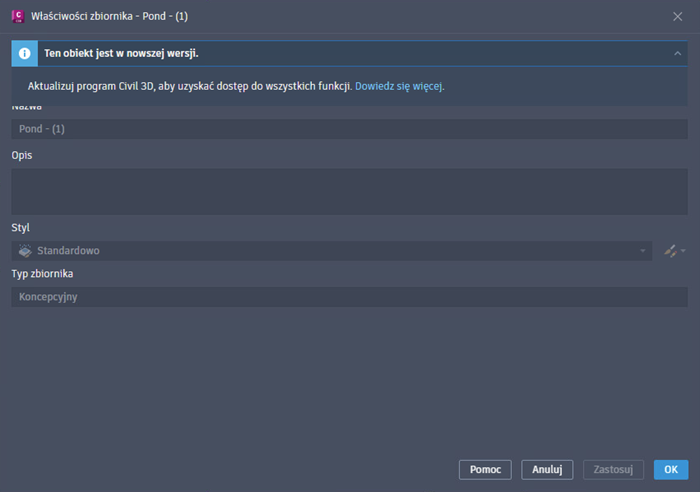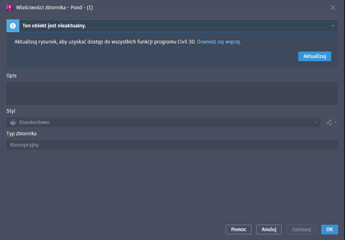 - Jeśli obiekt został utworzony w starszej wersji programu Civil 3D, wyświetlony zostanie znaczek „Ten obiekt jest nieaktualny”. Uaktualnij rysunek, aby uzyskać dostęp do wszystkich funkcji programu Civil 3D. Kliknij przycisk Uaktualnij, aby zaktualizować obiekt do bieżącej wersji. Po uaktualnieniu można wykonywać peł edycję obiektu.