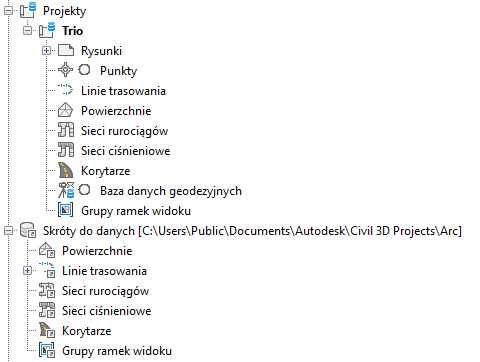 Rysunek przedstawia kolekcje projektu Vault o nazwie Trio oraz projekt skrótu do danych o nazwie Arc. Oba typy projektów są utworzone z domyślnego szablonu projektu. W rezultacie zawierają one identyczne kolekcje powierzchni, linii trasowania i innych obiektów, które mogą być dołączane jako odniesienia do wielu rysunków.