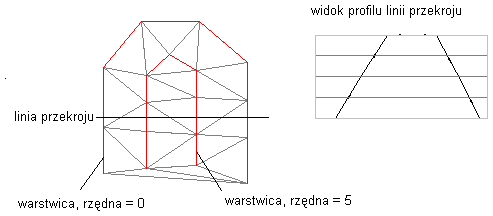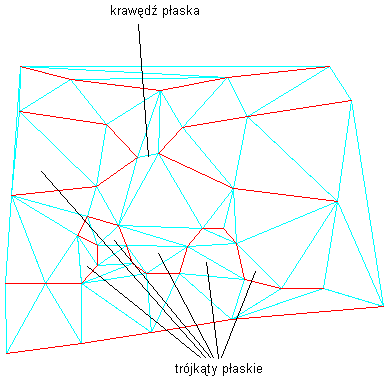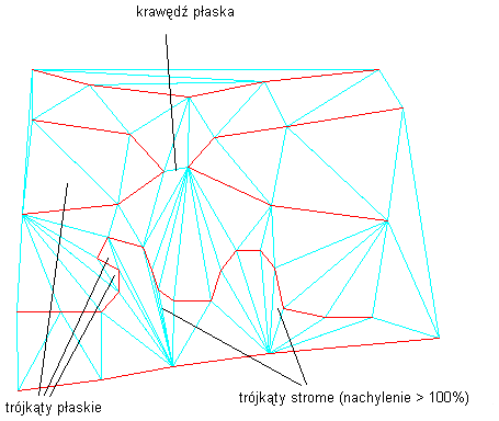 Na poniższej ilustracji przedstawiono powierzchnię zawierającą płaskie obszary, na której trójkąty (błękitne) utworzone zostały z czerwonych linii warstwic. Wskazane zostały niektóre płaskie trójkąty i krawędzie: