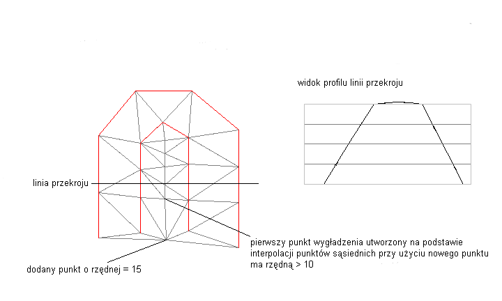 Uzyskane wyniki spowodowane są stosowaniem sąsiednich punktów przy interpolacji NNI do określania odpowiedniej rzędnej nowego punktu. Ponieważ wszystkie rzędne sąsiednich punktów są mniejsze niż rzędna trójkąta płaskiego, są one wybierane dla dodawanych punktów, co powoduje obniżenie grzbietu.