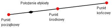 Dostępne są cztery punkty zakotwiczenia etykiety linii, które można dołączać do etykiet: punkt początkowy, końcowy, środkowy oraz położenie etykiety. Zakotwiczenie położenia etykiety można przeciągnąć w dowolne miejsce wzdłuż linii.