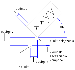 Położenie komponentu etykiety jest definiowane przez określenie komponentu zakotwiczenia, punktu zakotwiczenia i punktu dołączenia. Kąty obrotu oraz odsunięcia X i Y są stosowane w odniesieniu do komponentu zakotwiczenia i punktu zakotwiczenia.