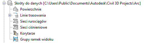 Skrótów do danych można używać w wypadku powierzchni, linii trasowania, profili, grup linii próbkowania, korytarzy, sieci rurociągów, sieci ciśnieniowych i grup ramek widoku.