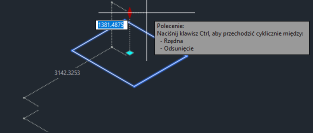 Zielony rombowy uchwyt umożliwia dostosowanie wysokości nad płaszczyzną lub odsunięcia pionowego retencji podziemnej. Ruch tego uchwytu jest zablokowany względem osi Z.