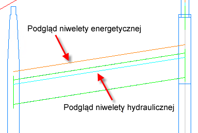 Poniższa ilustracja pokazuje szczegóły linii niwelety energetycznej i hydraulicznej w oknie podglądu.