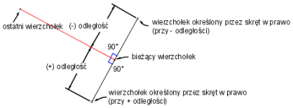 Istnieje możliwość definiowania zakrętów w prawo i w lewo, a tym samym tworzenia prostopadłych segmentów figury. Bywa to użyteczne podczas rysowania obrysów budynków Aby to polecenie działało prawidłowo, bieżąca figura musi zawierać co najmniej dwa wierzchołki.