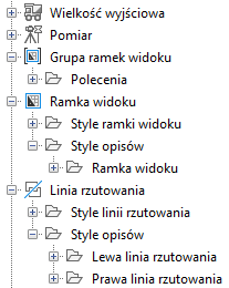 Na poniższym rysunku pokazano kolekcje ramek widoku i linii rzutowania w drzewie Ustawienia: