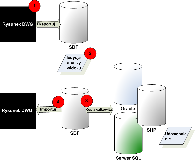 | Mapy lub poszczególne warstwy rysunku mogą być eksportowane do formatu Autodesk SDF, SHP lub Oracle. Następnie należy użyć opcji Kopia całkowita w celu przenoszenia do innych formatów. | Oryginalne dane DWG pozostają niezmienione. |