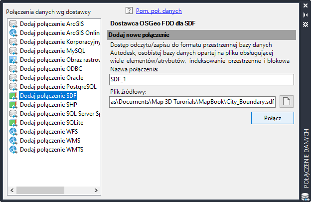 - W oknie Połączenie danych wybierz opcję Dodaj połączenie SDF z listy Połączenia danych wg dostawcy (po lewej stronie).