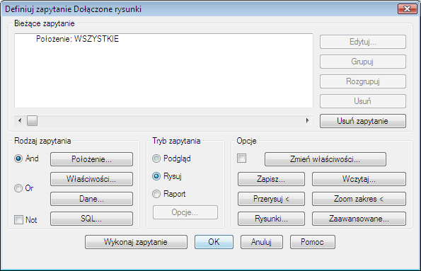 - W oknie dialogowym Definiuj zapytanie o dołączone rysunki w kategorii Rodzaj zapytania wykonaj następujące czynności.