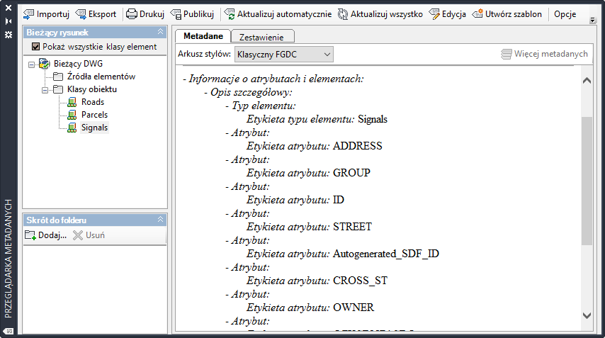 Jeśli rysunek zawiera sklasyfikowane obiekty, jego metadane są automatycznie generowane i wyświetlane po pierwszym otwarciu przeglądarki metadanych.