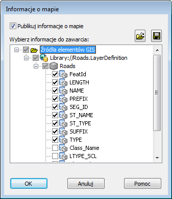 Należy ustawić opcje publikowania plików DWF określające informacje o atrybutach, które zostaną opublikowane wraz z mapą.