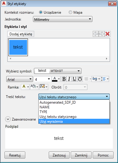 - W oknie dialogowym Styl etykiety w polu Treść tekstu wybierz opcję Użyj wyrażenia.