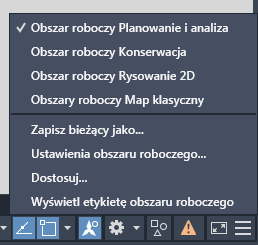 Program Zestaw narzędzi AutoCAD Map 3D zawiera wstępnie zdefiniowane obszary robocze. W każdym obszarze roboczym polecenia i paski narzędzi są uporządkowane i wyświetlane w inny sposób. Przy pierwszym uruchomieniu programu Zestaw narzędzi AutoCAD Map 3D wyświetlany jest monit o wybranie domyślnego obszaru roboczego.