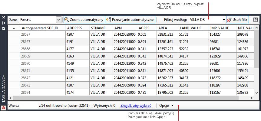 Kliknij przycisk Zastosuj filtr, aby wyświetlić tylko działki zlokalizowane na ulicy Villa Drive.