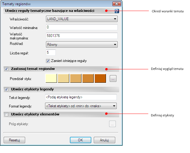 Definicję tematu należy powiązać z wartością działki: jasne kolory przedstawiają działki o niższej wartości, ciemne kolory - działki o wyższej wartości. Wartość działki jest "warunkiem" używanym do określania koloru tej działki na mapie.