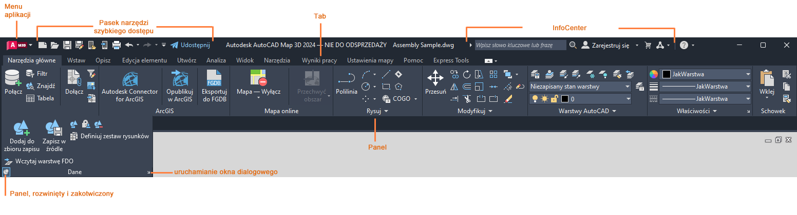 Aby kontynuować przegląd programu Zestaw narzędzi AutoCAD Map 3D, przejdź do części Znajdowanie poleceń.