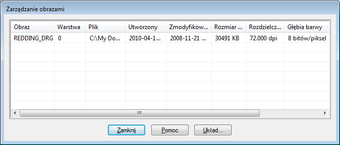 W oknie dialogowym Zarządzanie obrazem wyświetlane są informacje na temat wybranego obrazu.