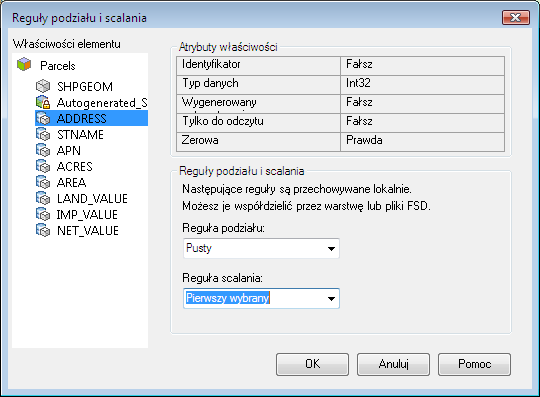 Każda właściwość elementu Działki znajduje się na liście Właściwości elementu. Dwie właściwości (Geom i IdElementu) są generowane przez składnicę danych, zatem nie można ustawić dla nich reguł podziału i łączenia. Jeśli wybierzesz te elementy, zostaną wyświetlone reguły, z których korzysta określona składnica danych, gdy wykonywany jest podział/łączenie elementów.