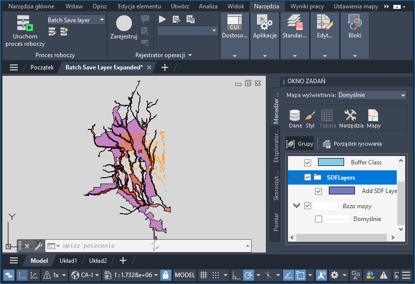 Do mapy oraz do nowej grupy Menedżera wyświetlania zostaną dodane warstwy. Zostanie wyświetlony monit o podanie nazwy i położenia pliku DWG. W położeniu określonym w tym działaniu zostaną zapisane pliki z rozszerzeniem .layer.