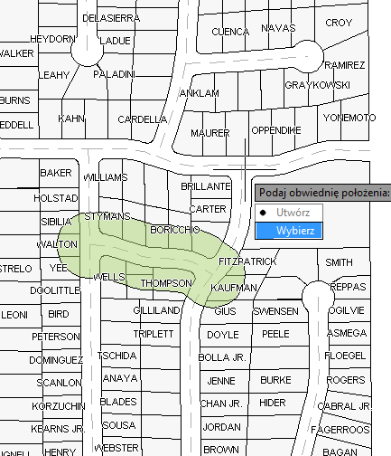 Kliknięcie opcji Wybierz przy zgłoszeniu. Wybranie buforu jako warunku położenia.