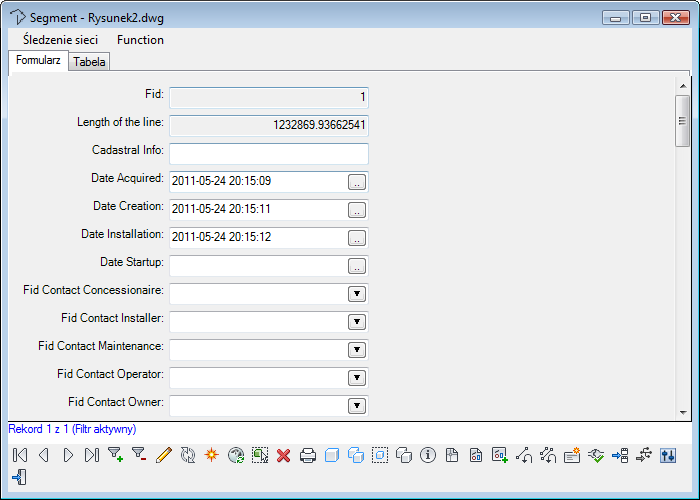 Tabela danych przedstawia elementy geoprzestrzenne w formacie tabelarycznym. W Widoku danych wyświetlane są dane zewnętrzne połączone z obiektami rysunku. W formularzach klas elementów wyświetlane są dane atrybutów elementów modelu branżowego.