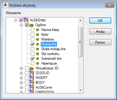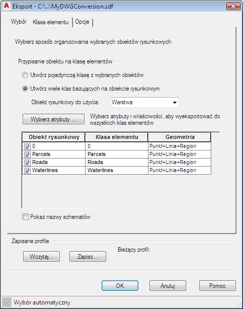 Atrybuty określone w tej sekcji zostaną przypisane do każdej klasy elementów w pliku SDF. Dlatego należy wybrać tylko atrybuty odpowiednie dla wszystkich. Przykładowo możesz wybrać właściwości ogólne, które obejmują np. szerokość linii, ale nie właściwości danych obiektu, które są określone dla każdej klasy elementów.