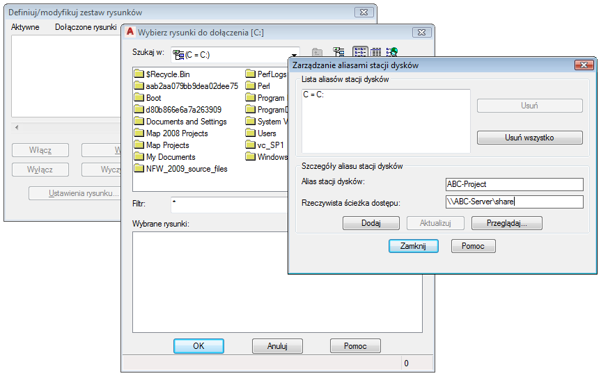Alias napędy umożliwia wielu użytkownikom korzystanie z jednej nazwy ścieżki dla rysunku zapisanego na dysku udostępnionym. Dzięki temu użytkownik może odwzorować dany napęd na napęd o innej literze.