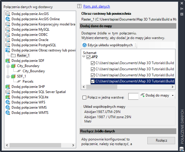 - W kategorii Połączenia danych wg dostawcy wybierz opcję Dodaj obraz rastrowy lub połączenie powierzchni.