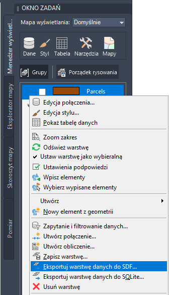 - W Menedżerze wyświetlania kliknij prawym przyciskiem warstwę Działki i wybierz Eksportuj dane warstwy do pliku SDF.