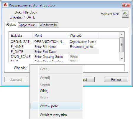 Kliknij prawym przyciskiem wartość, aby wstawić pole.