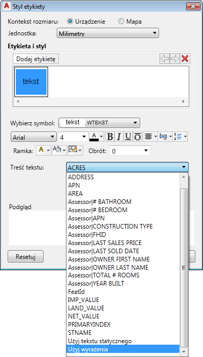 Za pomocą wyrażenia można określić tekst dla etykiet.