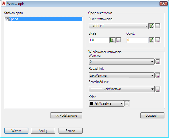 Szablon rysunku zdefiniowany w poprzednim ćwiczeniu zostanie użyty w celu wstawienia wystąpień opisu do rysunku. Dla każdego obiektu rysunku, którego tabela danych obiektu zawiera dane ograniczenia prędkości, zostanie wyświetlona jego własna wartość ograniczenia prędkości.