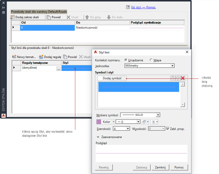 - Zdefiniuj inny przedział skali i określ dla niego styl linii ciągłej.