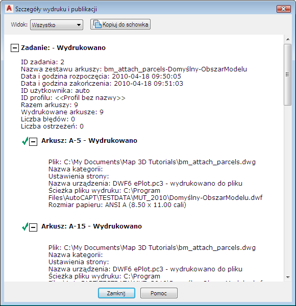 Dostosowano szablon skoroszytu mapy i użyto go do utworzenia skoroszytu. Skoroszyt mapy został opublikowany w formacie DWF umożliwiającym udostępnianie go osobom, które nie dysponują kopią Zestaw narzędzi AutoCAD Map 3D. Takie osoby mogą oglądać mapy w przeglądarce Autodesk Design Review, którą można pobrać nieodpłatnie. Program Autodesk Design Review jest dostępny pod adresem http://www.autodesk.pl/designreview.